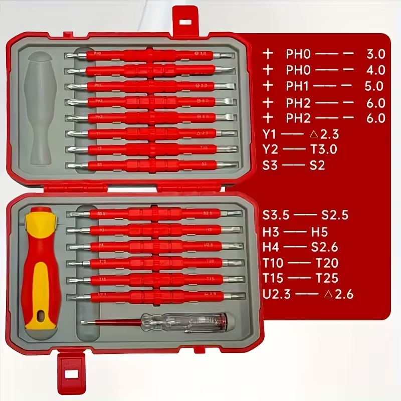- Composition de produit : cet Ensemble de tournevis isolés 29 en 1: comprend 12 lames interchangeables avec huit types d’embouts: 4 carrés ; 4 fendus ; 3 Phillips ; 3 fendus (tournevis à tête plate) ; 5 Torx ; 2 en forme de U ; 2 triangles ; 2 de type Y ; 3 hexagonaux ; 1 testeur de tension et 1 poignée amovible.