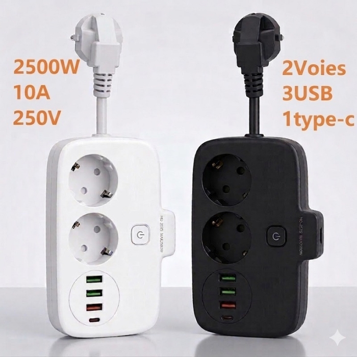 Rallonge Multiprise Intelligent 6 En 1 Avec 3USB, 2 Prises,1 Type C