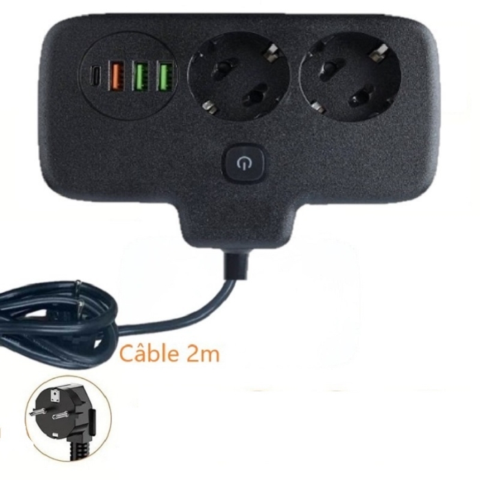Multiprise Intelligent:  Prise de distribution 2 prises avec 3 USB et 1 USB C et dispose un  interrupteur.